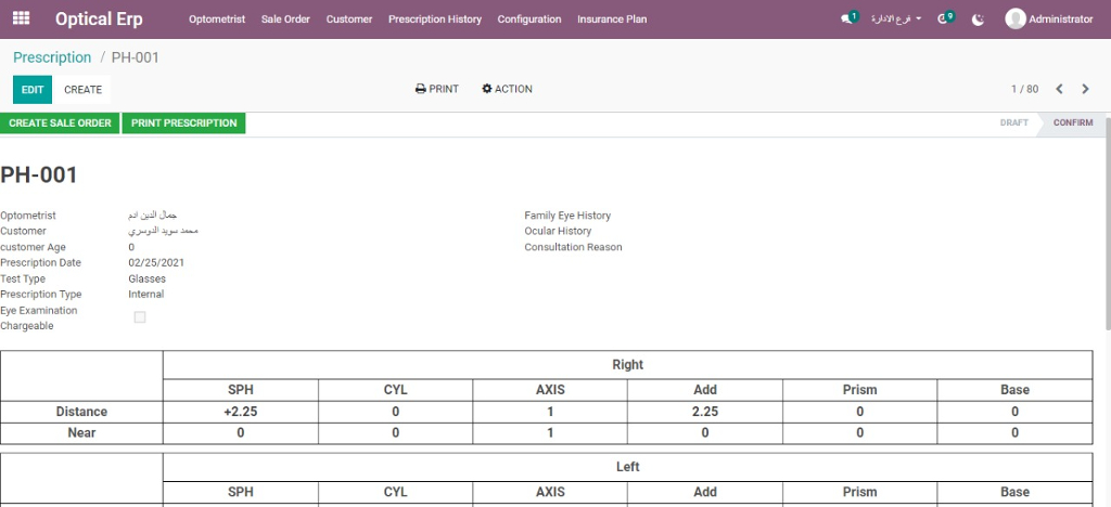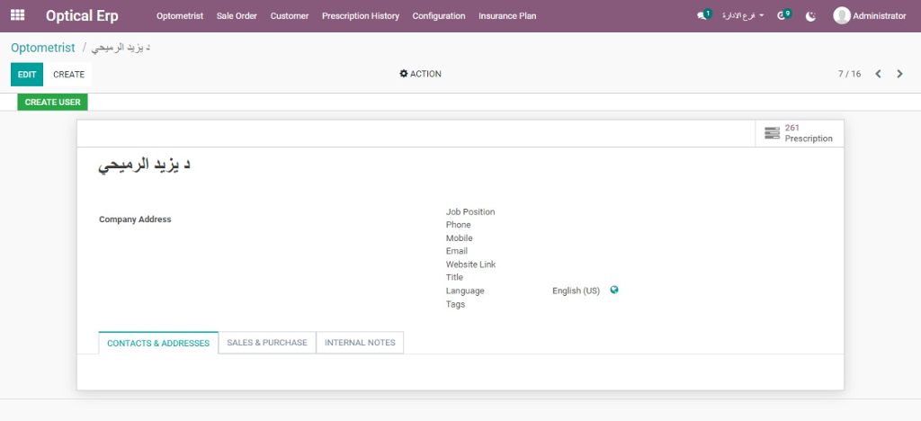 - Ophthalmology and eye clinics Odoo optical management program offers the possibility of recording all the primary data of the patient such as name, number, or address, and also searching for it with ease.