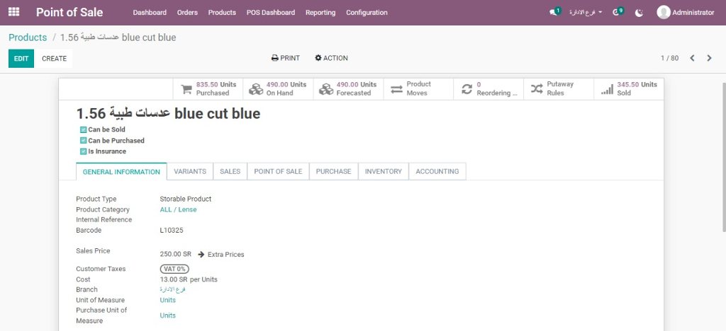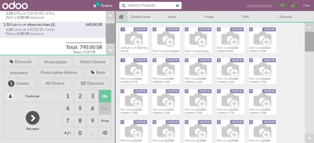 With a simple and advanced screen, you can issue electronic invoices containing a QR code and carry out tax transactions on them with ease. The system also allows you to calculate bill payments according to the insurance company to which the customer belongs, and calculate the percentage of the agreed discount and share. And Odoo gives you an easy interface for POS sales, to increase the speed of sales in your eyewear store.